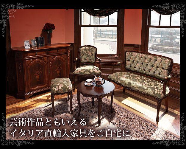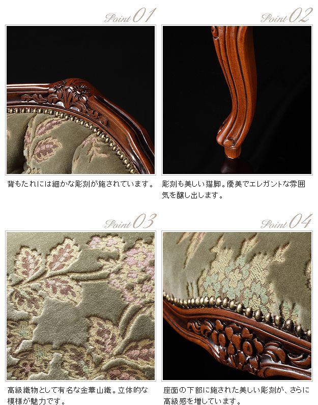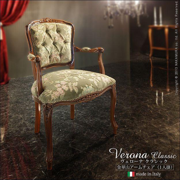 商品について:芸術作品ともいえるイタリア直輸入家具をご自宅に☆ヴェローナクラシック金華山アームチェア(1人掛け)。立体感のあるしっとりとした質感の金華山織は華やかで高級感があります。フレームに施された彫刻と美しい猫脚も魅力的。滑らかな曲線を描くフォルムと豪華な金華山織がお部屋をエレガントに演出します。