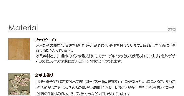 材質:脚部・フレーム-天然木(ビーチ)、ラッカー塗装、張り地(金華山織)-アクリル42%・ポリエステル32%・レーヨン26%、中身-ウレタンフォーム・コイルスプリング