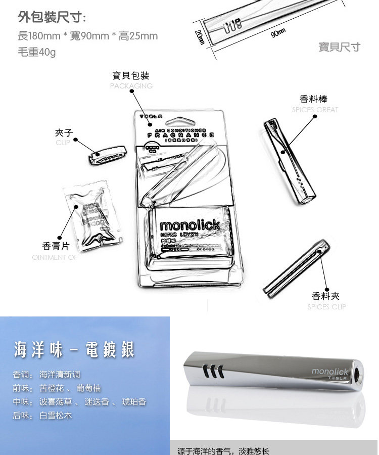 Features 1, section "magic wand" continued the sales of 10 models are very good, "awesome" approximate shape, but also on the basis of the original increase of angular, added two "silver plating" "plating black" color . Design atmosphere, simple. 2, four flavor to choose from: lemon, green tea, white musk, ocean flavor. 3, built-in spice sticks can be replaced Installation Method Please refer to the instruction manual inside of the jam Caution 1. Do not attempt to change the use of this product 2. Do not install airbags to hinder the operation and after falling stuck pedal while driving, dangerous. 3, the use of suction cups, do not install on the windshield and side windows affect the car's rearview mirror to use, if you obstruct the driver line of sight, it will be dangerous. 4. Do not touch the air freshener in the car seat and other items. As touching accidentally occurs, immediately and thoroughly wipe clean with a damp towel.