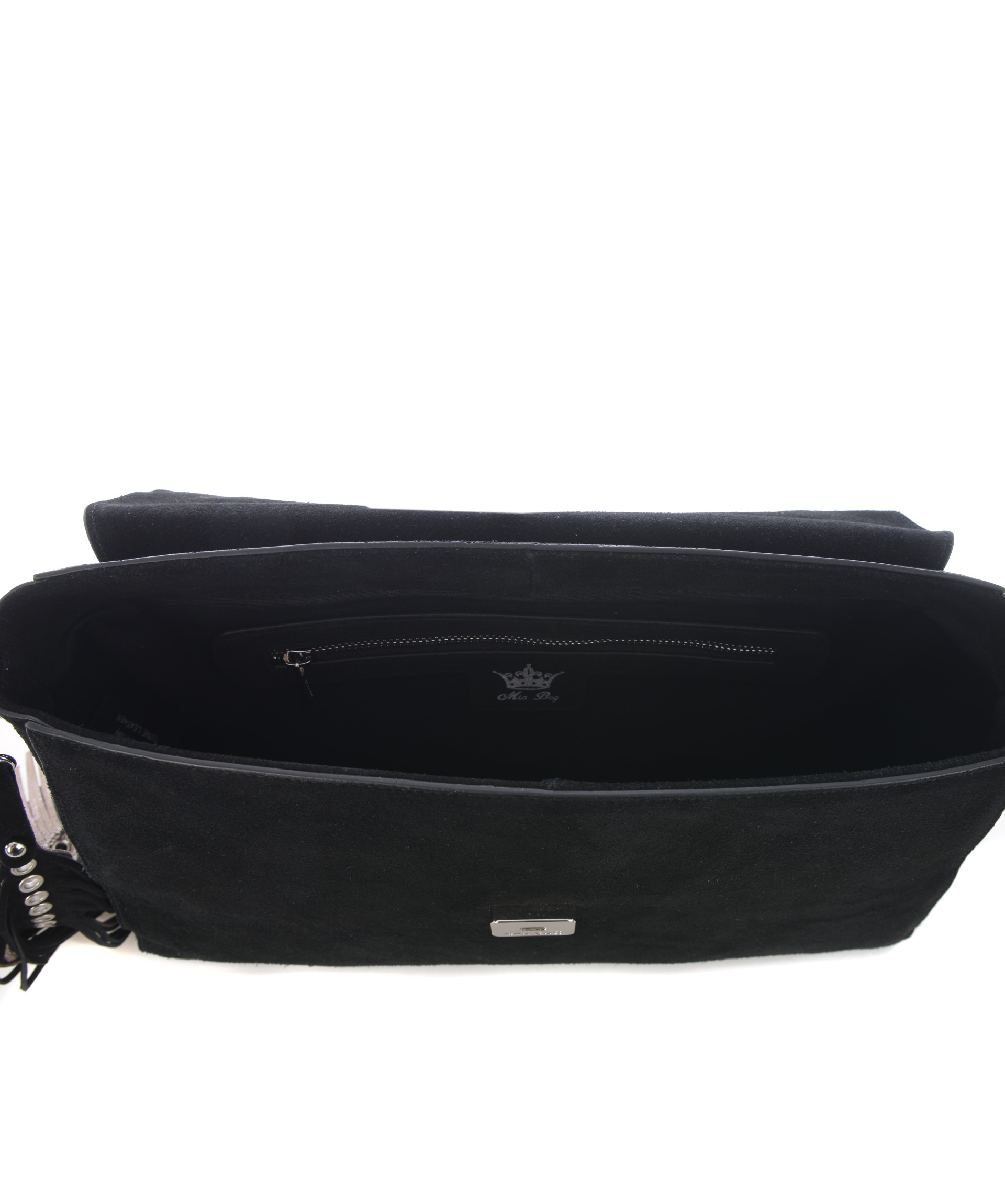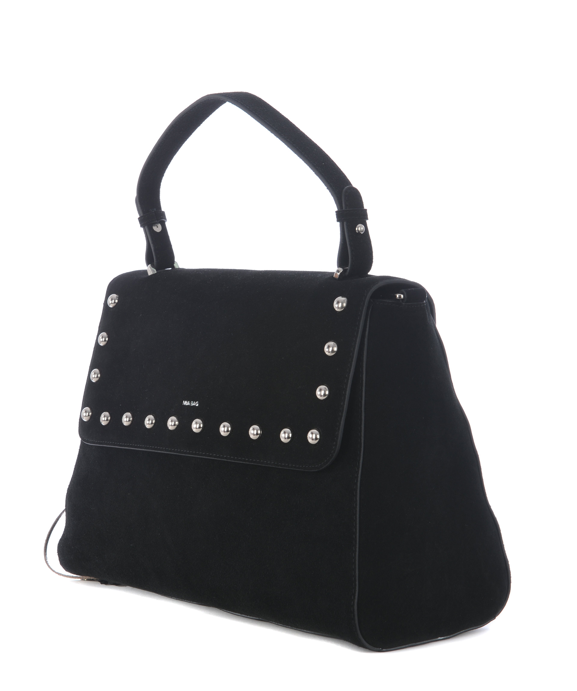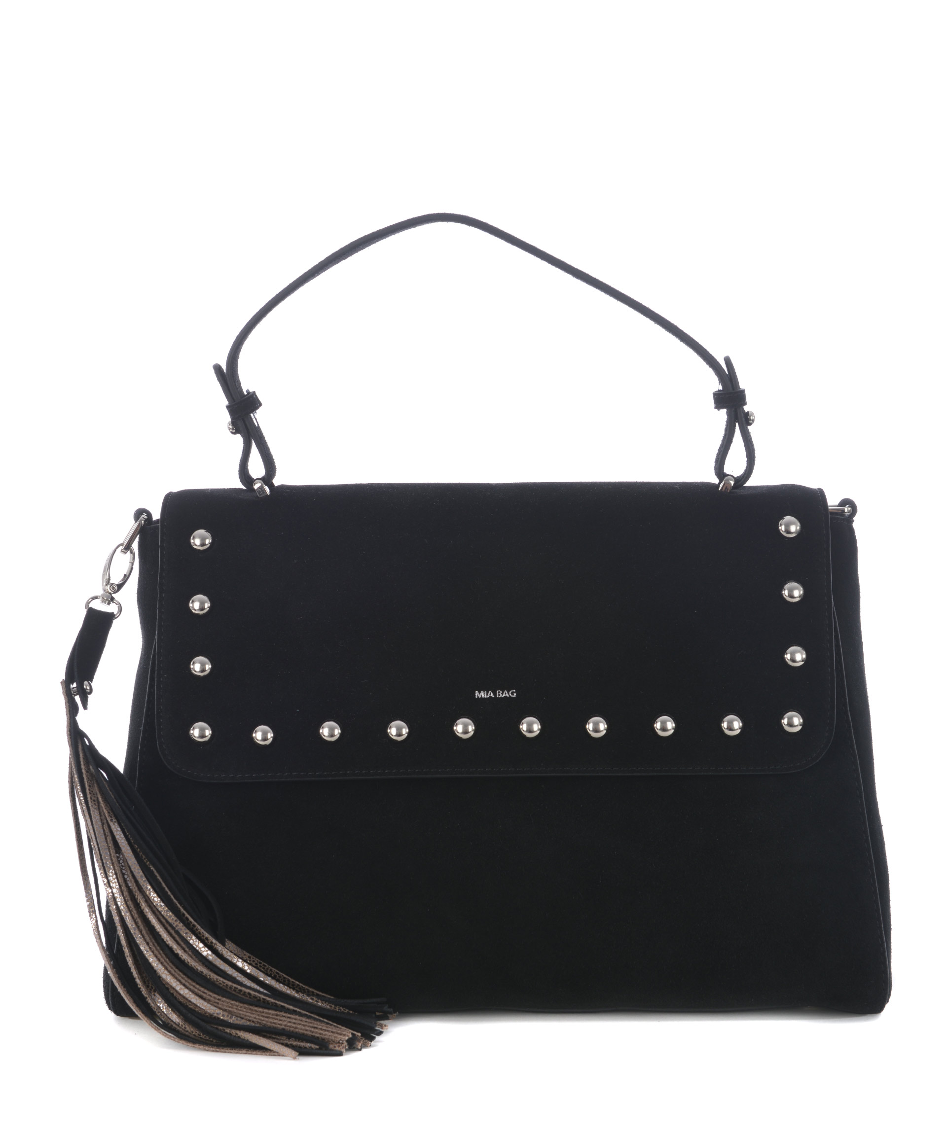 Borsa a cartella Mia Bag in pelle scamosciata Nera. Un manico morbido removibile. Tracolla removibile. Patta frontale decorata con borchie argento. Chiusura ad incastro. All'interno tasche applicate e tasca con zip. Foderata. Piedini metallici alla base. Nappina removibile.