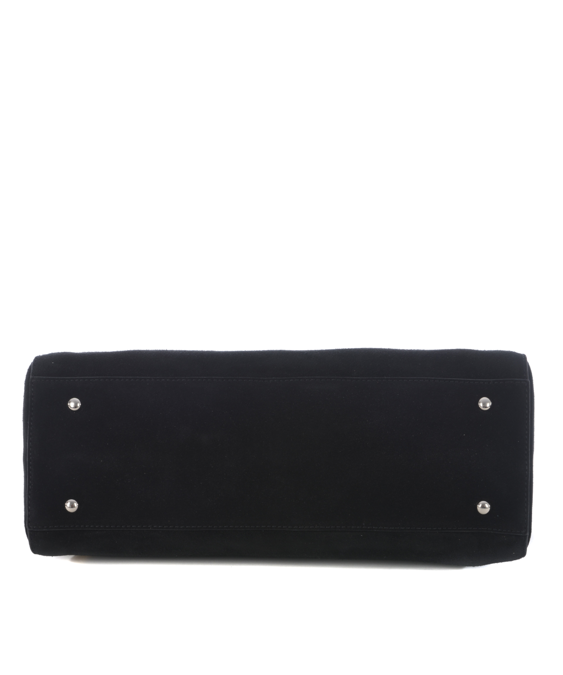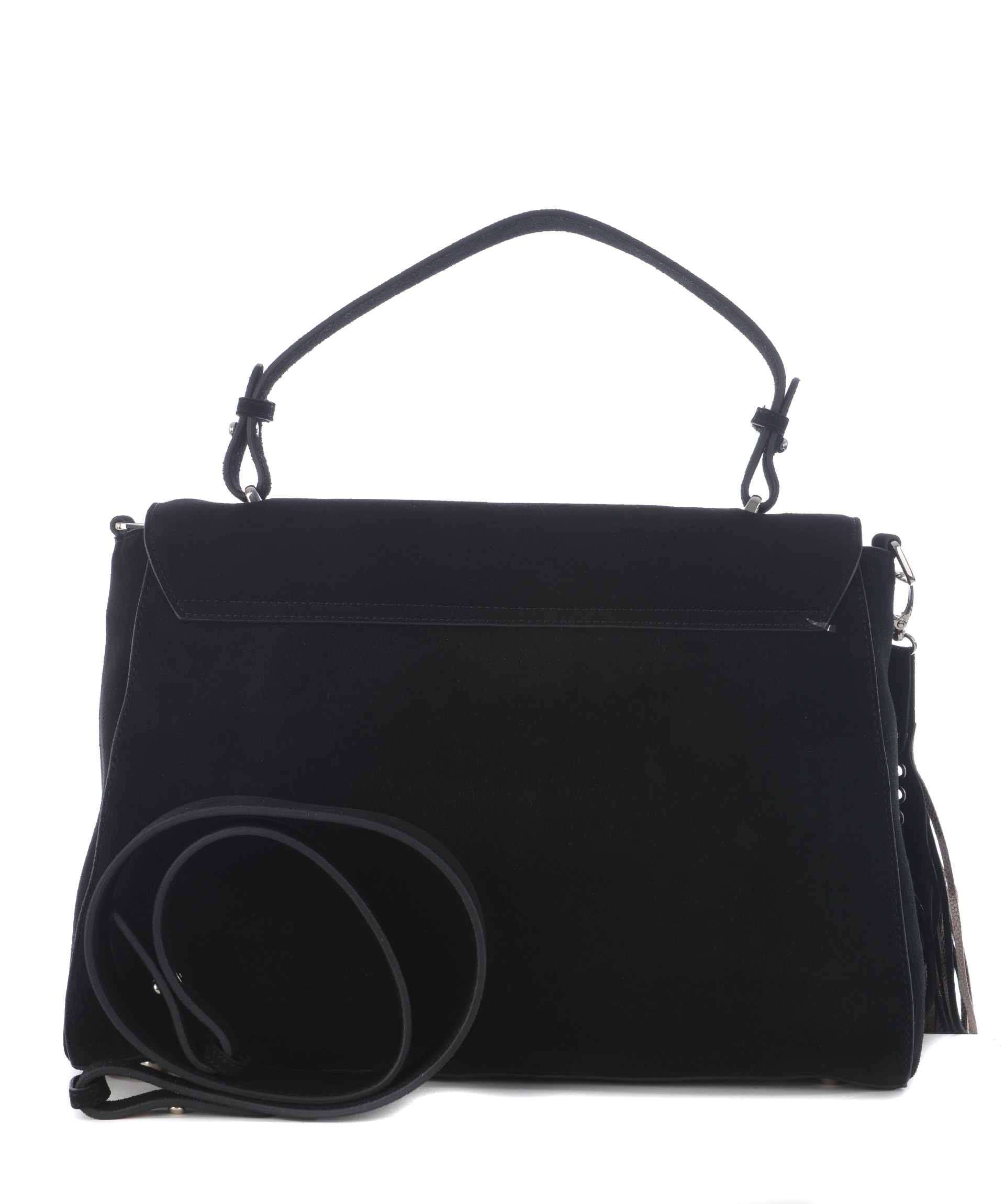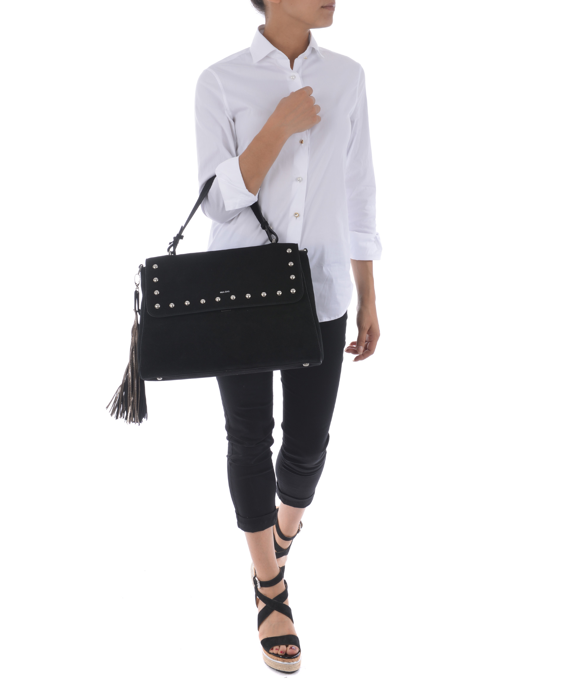 Borsa a cartella Mia Bag in pelle scamosciata Nera. Un manico morbido removibile. Tracolla removibile. Patta frontale decorata con borchie argento. Chiusura ad incastro. All'interno tasche applicate e tasca con zip. Foderata. Piedini metallici alla base. Nappina removibile.