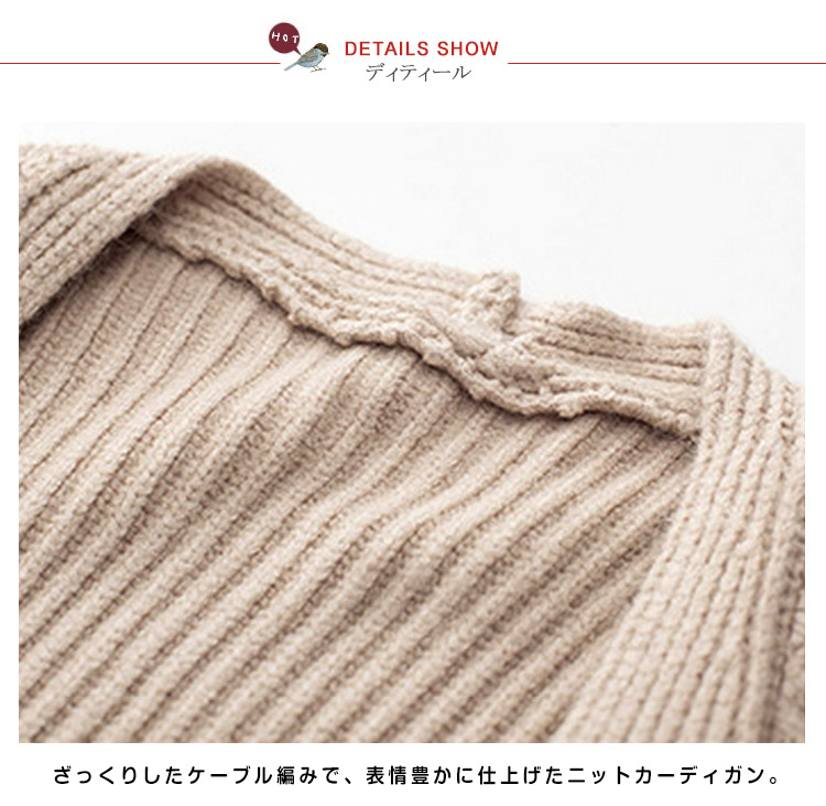 | 大人気のケーブルニットカーデが待望の登場★袖と裾はリブ仕様で着用を繰り返しても伸びにくい★もちろんレイヤードコーデをしても着膨れしにくい設計★ゆるっと包まれルックで愛されコーデが完成すること間違いナシ★ | |