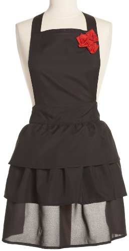 - Each black ruffled hostess apron features fitted bodice with red rose detail, and black tiered ruffled skirt