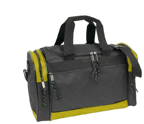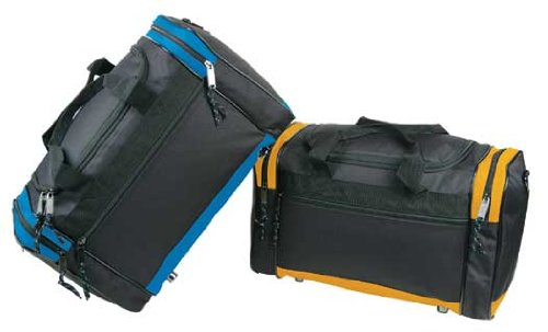 -. Feature : FEATURES: Large zippered main compartment, two end zippered pockets, front zippered pocket, handle & removable shoulder strap. / MATERIAL: 600D Polyester w/ vinyl backing / SIZE: 17" X 10" X 9". / COLORS: Black, Black/Royal, Black/Red, Black/Gold, Black/Dark Green. / INTENDED USE: Gym, Sports, Travel, Carry-on, Lage, Camping, Hiking and More!