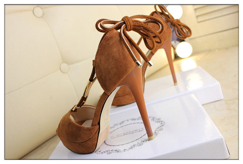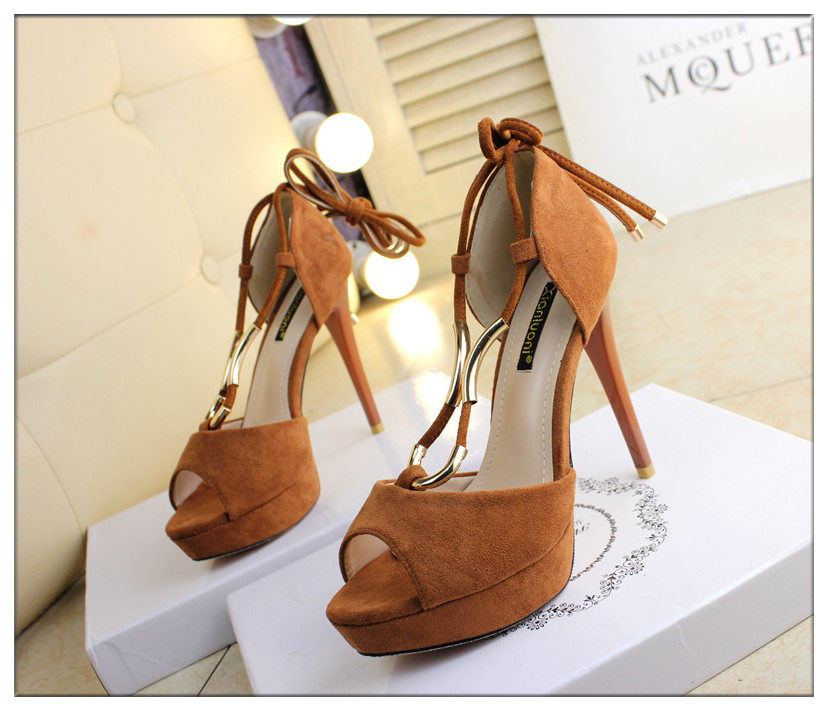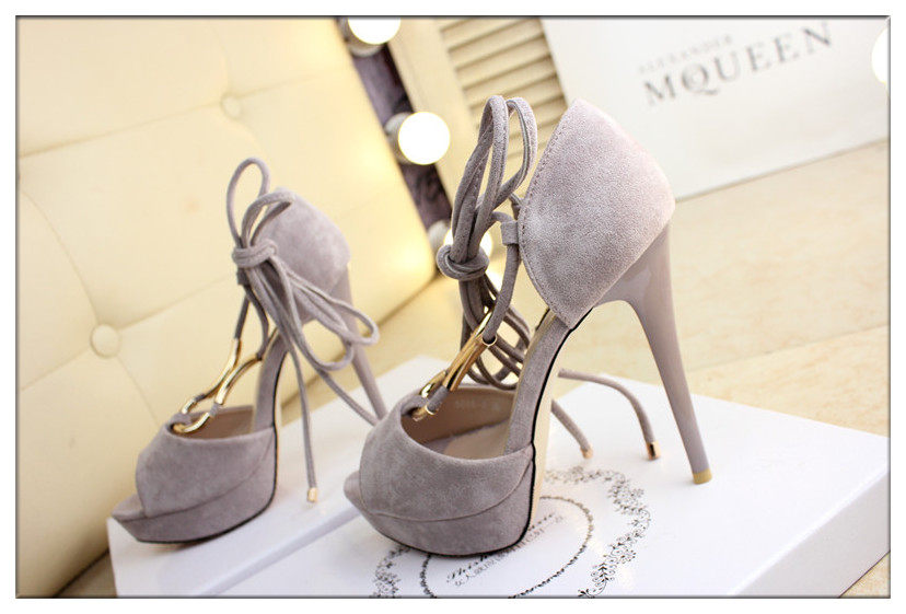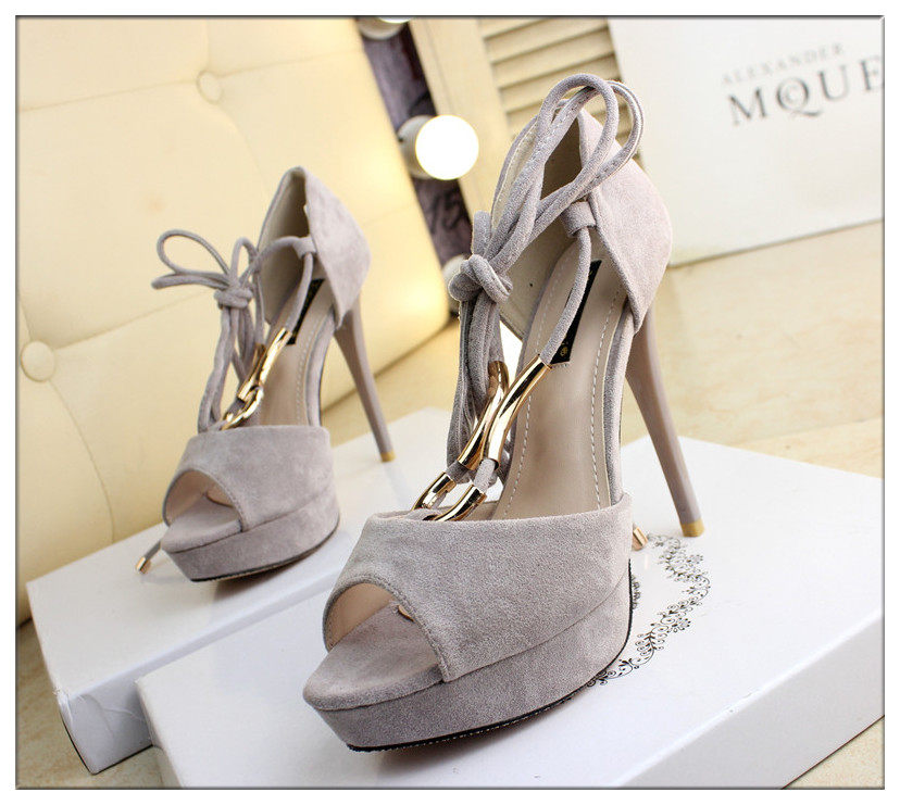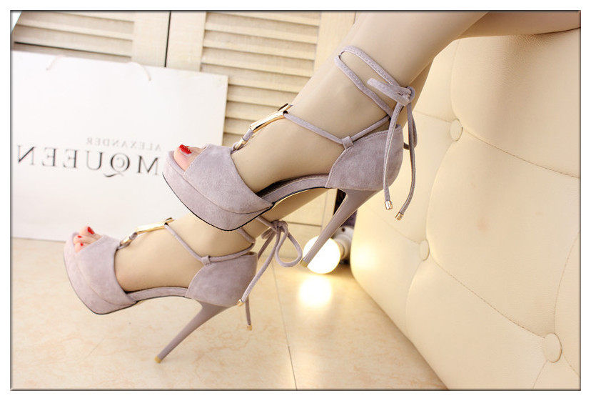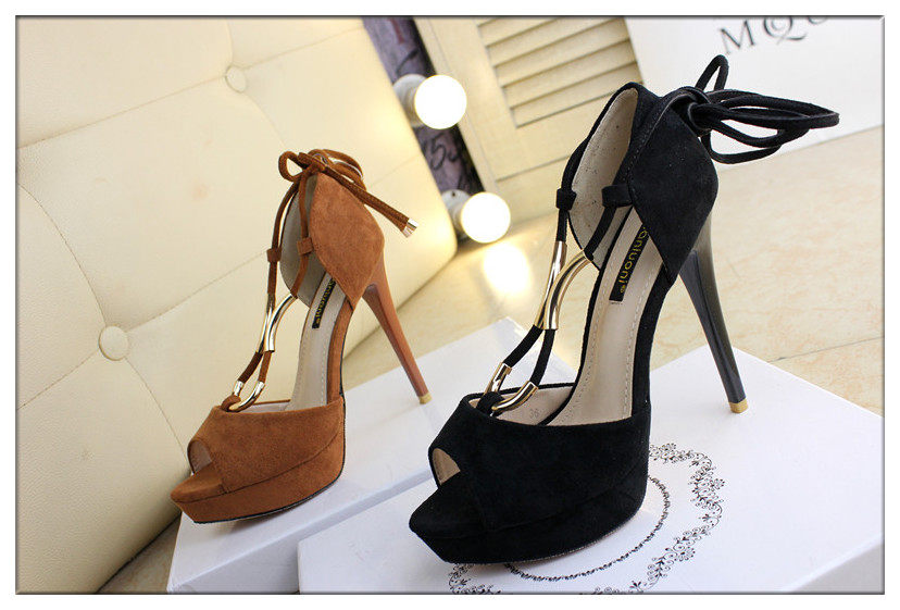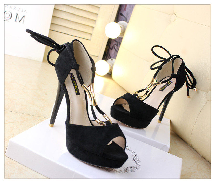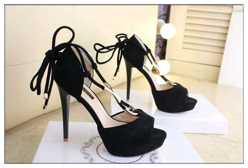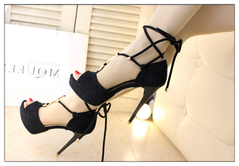 12cm性感绒面绑带高跟凉鞋细跟防水台鱼嘴凉鞋黑色包跟夏女鞋