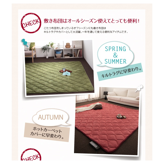 ※본 상품이 깔아 이불은,러그나 핫 카펫트 커버로서도 심부름꾼이 됩니다.또한상난방 에도 대응하고 있습니다.사용하실 때는,핫 카펫트 또는상 난방 본체의 주의사항에 따라서 사용 하십시오.또한핫 카펫트,상난방을 사용 때는,전원을 세세하게 끄면서(도) 연속해 장시간 사용하시지 않는 바와 같이(하도록) 주의해 하십시오.