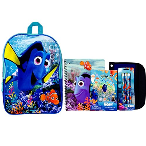 Pixar Finding Dory Backpack great for returning to school. Includes 1 Subject Notebook 70 Wide Ruled Notebook 10.5 inch x 8 inch (26.7cm x 20.3 cm) Zipper Binder Pouch 3Holes 1 Pocket Sticker Book 4 Sheets and 6 Pack of Pencils