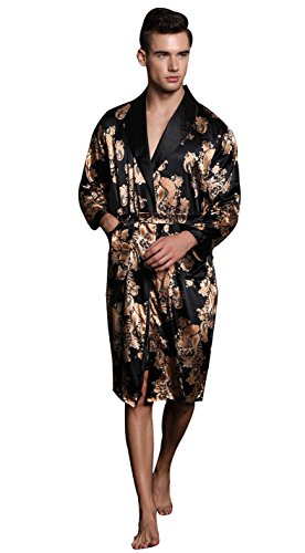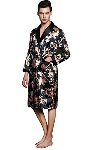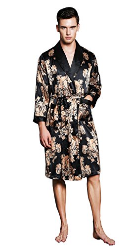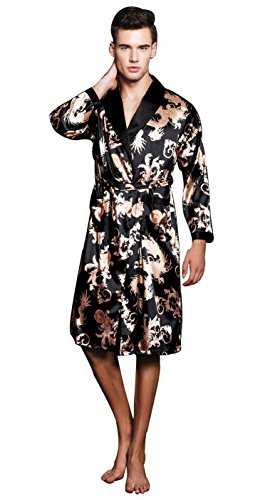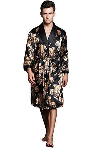 SexyTown Long Satin Lounge Print Bathrobe Men's Charmeuse Sleepwear with Pockets Medium B-Black