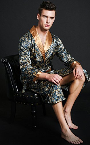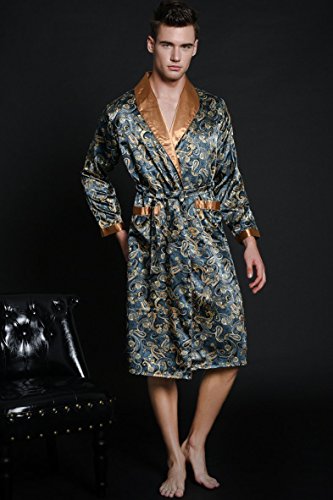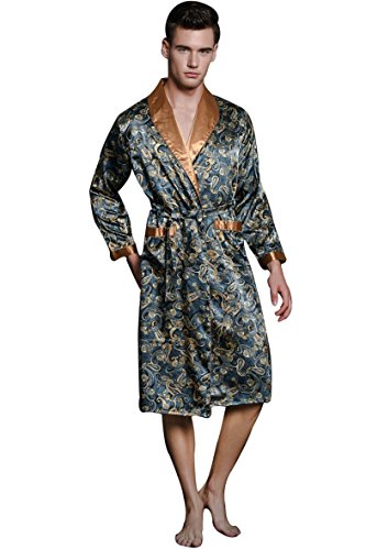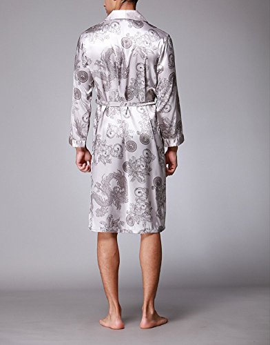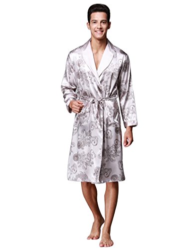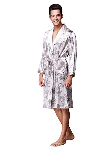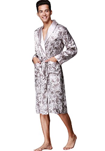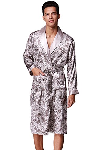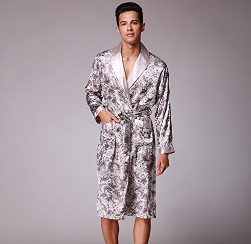 SexyTown Long Satin Lounge Print Bathrobe Men's Charmeuse Sleepwear with Pockets Large A-Gray