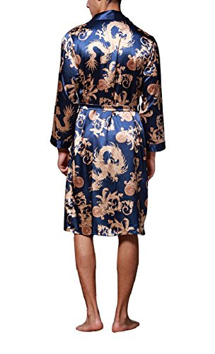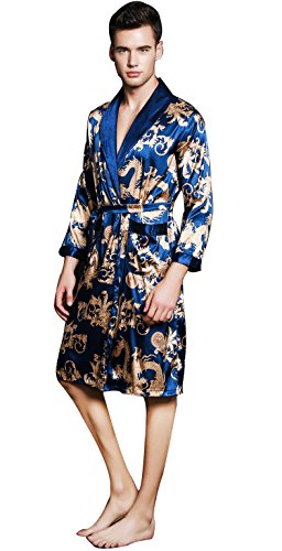 SexyTown Long Satin Lounge Print Bathrobe Men's Charmeuse Sleepwear with Pockets Large Navy Blue