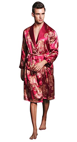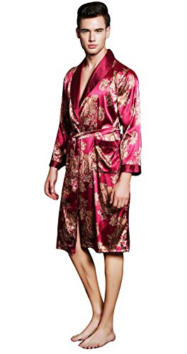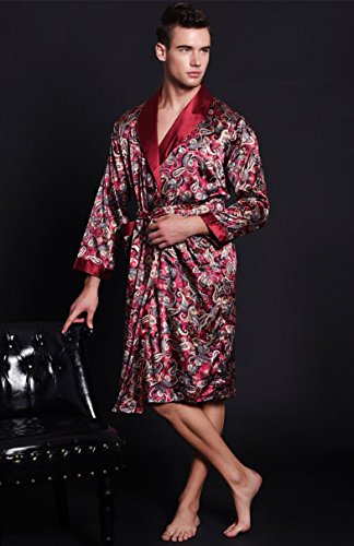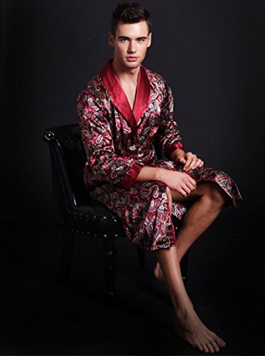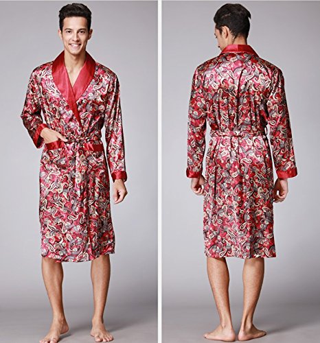 SexyTown Long Satin Lounge Print Bathrobe Men's Charmeuse Sleepwear with Pockets Large B-Wine Red