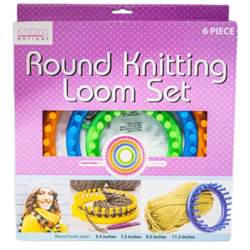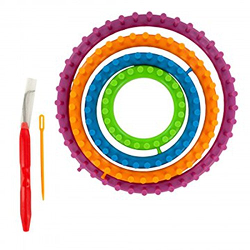 - START KNITTING INSTANTLY. The round knitting loom set contains 4 plastic pegged looms in sizes: 5.5", 7.5", 9.5" and 11.5", a metal hook tool, a plastic needle, and 2 brightly colored 40 yards acrylic yarn.