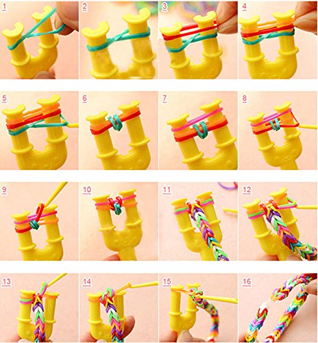 룸(직기)에 컬러풀한 고무를 걸어(걸쳐) 자유로운 발상으로 여러가지 타입의 팔찌 등의 악세사리를 만들 수 있습니다.