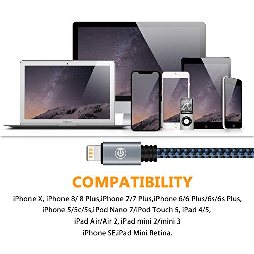 Universal Compatibility "I" devices: iPhone X/ 8/ 8 plus, iPhone 7/ 7 plus, iPhone 5/ 5c/ 5s/SE, iPhone 6/ 6 Plus/6s/6s Plus, iPod Nano 7, iPod Touch 5, iPad4/Pro, iPad Air/ Air 2, iPad mini4/3/2, Mini Retina. NOT compatible with iPhone 4, iPad2, iPad 3, iPod Nano 6, iPod Touch 4. Over 5000 bends The reinforced joint and durable Braided-nylon material help extend the life of the cable. Past 5000 times bend test and no damage or change in performance is found. Heat-resistant and High Speed Well-built aluminum connectors ensure complete safety and reliability. High-quality copper wire ensures fast charging and data sync. Great Convenience Spare cords prepared for every charging need. You may not realize them since they are so small but when you need, they are close at hand. What will you get? 3 *6ft/2m?Durable Nylon Braided Lightning Cables. Warranty Support We believe in our products.?We back them with an 12-month warranty and?100% customer satisfaction guarantee. Warm Tips? a. Please do not wiggle the cable out of your device after finishing a charging.? b. Please ensure the power output do not exceed 2 A/ 5V or 6V/ 3A when charged with our lightning to USB cable.? c. Please avoid covering the charging cable or phone with any non-thermal covering, such as quilt, blanket.? d. please keep the connector dry and clean 0 |
