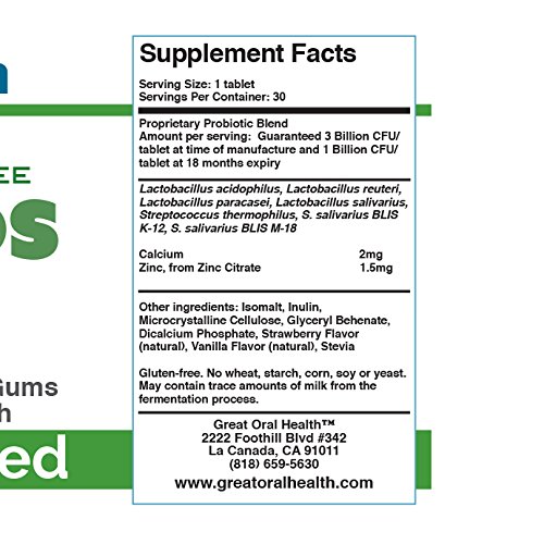 -. Binding : Health and Beauty -. Brand : Great Oral Health -. EAN : 0867171000099 -. Feature : Transform Your Kids Dental Checkups and Help Them to Build Healthier Teeth and Gums for Life / A Powerful Boost to Your Child's Immune System, Help Prevent Colds Sore Throats and Sinus Infections / Safe and All-Natural Chewable Tablets that are 100% Made in the USA for Trusted Quality and Security / A Strong and Potent Blend of Oral Probiotics-with the patented LIVE BAC process for lasting strength / Perfect Supplement for Teens with Braces and Helping Them to Maintain Better Oral Health -. IsAdultProduct : 0 -. Label : Great Oral Health USA -. Manufacturer : Great Oral Health USA -. MPN : Kids Oral Probiotics: Strawberry -. PackageQuantity : 30 -. PartNumber : Kids Oral Probiotics: Strawberry -. ProductGroup : Health and Beauty -. ProductTypeName : HEALTH_PERSONAL_CARE -. Publisher : Great Oral Health USA -. Studio : Great Oral Health USA -. Title : CHEWABLE CHILDREN ORAL PROBIOTICS-7 Strains With BLIS K12 & M18. Fight Cavities & Tooth Decay, Improve Dental Hygiene & Gum Health, Immune Support against Sore Throats, Colds and Ear Infections -. UPC : 867171000099