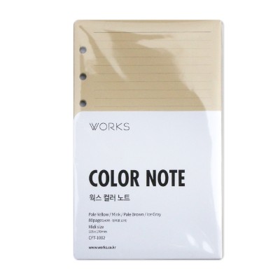 컬러 노트는 시각적 안정감을 주는 차분한 파스텔 톤의 색지노트로, Pale Yellow, Pale Brown, Mink, Ice Gray 등 4가지 컬러의 노트가 각 10매씩 총 40매로 구성된 솔루션 제품입니다.