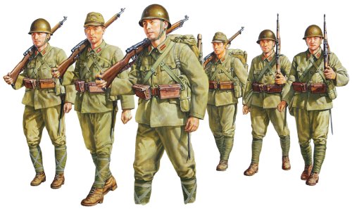 昭和13年制定の九八式軍衣を着た歩兵6体のセットです。装備品は全て別パーツとし、武装は三八式歩兵銃/九九式小銃を6丁ずつセットします。