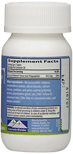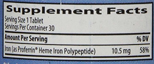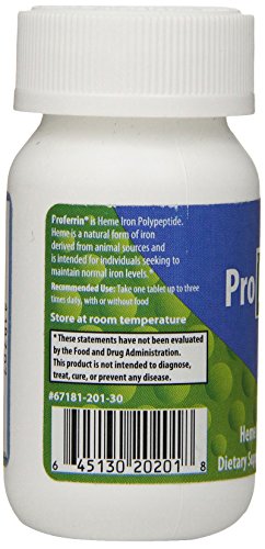 -. Binding : Health and Beauty -. Brand : Proferrin ES -. Color : Blue / Green -. EAN : 0645130202018 -. Feature : Oral iron that works / 10.5 mg of Iron as Heme Iron Polypeptide / Naturally occurring iron source / Recommended Use: Take one tablet up to three times daily, with or without food / Made in the USA by Colorado Biolabs, Inc -. IsAdultProduct : 0 -. Label : Proferrin ES -. Manufacturer : Proferrin ES -. NumberOfItems : 1 -. PackageQuantity : 1 -. ProductGroup : Health and Beauty -. ProductTypeName : HEALTH_PERSONAL_CARE -. PublicationDate : 2014-08-11 -. Publisher : Proferrin ES -. ReleaseDate : 2014-08-08 -. Studio : Proferrin ES -. Title : Proferrin ES Heme Iron Polypeptide Dietary Supplement, 30 Count -. UPC : 645130202018 Proferrin ES is a Dietary Iron Supplement that is Made in the USA by Colorado Bio labs, Inc. Each Tablet contains 10.5 mg of Iron as Proferrin Heme Iron Polypeptide. Heme is a natural form of iron derived from animal sources and is intended for individuals seeking to maintain normal iron levels. Recommended Use: Take one tablet up to three times daily, with or without food. Proferrin ES should be stored at room temperature. These statements have not been evaluated by the Food and Drug Administration. This product is not intended to diagnose, treat, cure or prevent any disease.