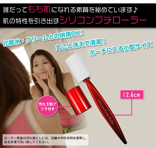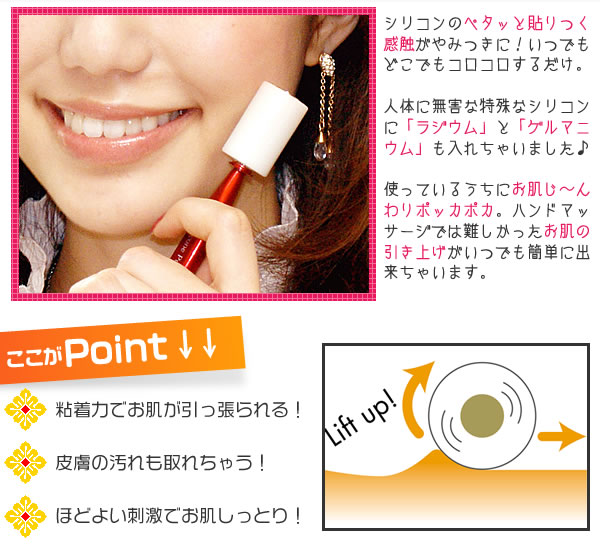 | シリコンのペタッと貼りつく感触がやみつき!ローラーは特殊なシリコンに「ラジウム」と「ゲルマニウム」を配合。くっつきながらリフトアップされてる~って実感できちゃう注目の美容ローラーです。 |