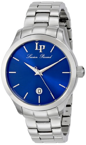 Blue dial with silver tone hands, hour markers and brand initials at 12:00