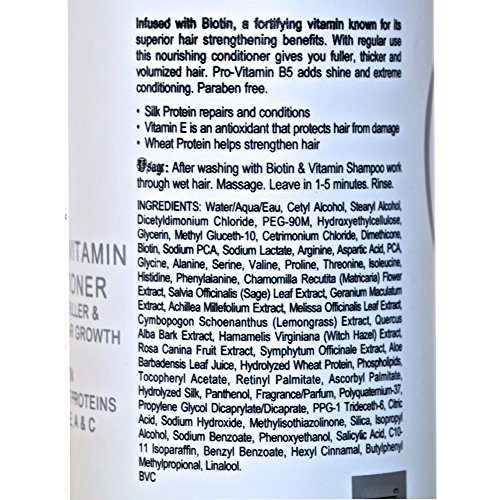 THIS CONDITIONER REQUIRES 30 DAYS TO SEE RESULTS. Biotin conditioner made in California, infused with biotin, a fortifying vitamin known for its superior hair strengthening benefits. With regular use this nourishing conditioner gives you fuller, thicker and volumized hair. Pro-vitamin b5 adds shine and extreme conditioning. Paraben free. ¥ silk protein repairs and conditions ¥ vitamin e is an antioxidant that protects hair from damage ¥ wheat protein helps strengthen hair usage: after washing with biotin & vitamin shampoo work through wet hair. Massage. Leave in 1-5 minutes. Rinse.