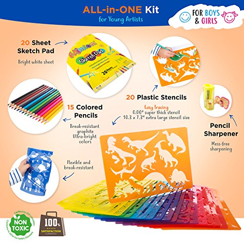 ALL-IN-ONE KIT: 20 plastic stencils (10.3" x 7.3"), 15 ultra-bright colored pencils, a pencil sharpener and a sketchbook.