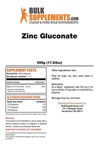 Studio : Bulksupplements Publisher : Bulksupplements Binding : Health and Beauty Product Description Zinc gluconate is one of the more highly preferred supplements for zinc due to its relatively high bioavailability and its ease on the stomach. It is made up of one atom of zinc and two atoms of gluconate for every molecule in this compound. Zinc is useful for a variety of reasons. It is able to keep the immune system healthy, along with the digestive and reproductive systems. It also carries out many other important tasks such as cell reproduction, balancing of hormones, and absorbing vitamins and minerals correctly, not to mention the synthesis of proteins, making this a very important mineral. 0