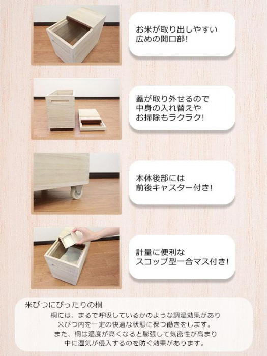 fk094igrjs開口部を大きく取っているので、お米が非常に出しやすい!移動がしやすいキャスター付きですサイズ(約)幅30×奥行44.5×高さ46cm個装サイズ:49×34×49cm重量約3100g個装重量:4400g素材・材質本体:天然木(桐材)取っ手、脚部:パイン材(ラッカー塗装)仕様完成品スコップ型一合マス付き製造国中国お米を美味しく収納!!開口部を大きく取っているので、お米が非常に出しやすい!移動がしやすいキャスター付きです