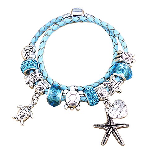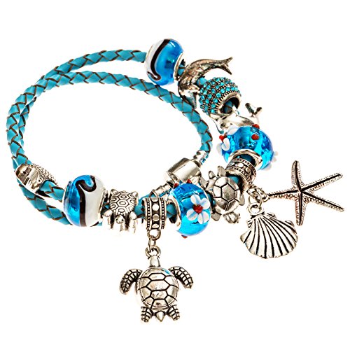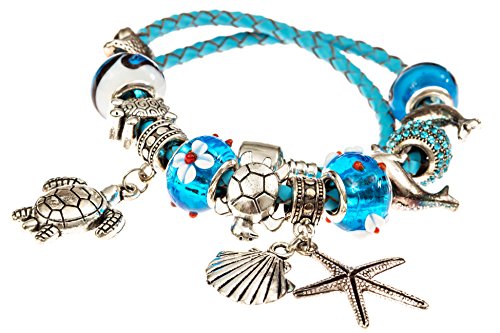 FEATURES barrel snap clasp that is easy to open / close and 925 silver plated Sea Shell and Star fish and turtle dangle beads that symbolize Ocean World and Love and Affection.