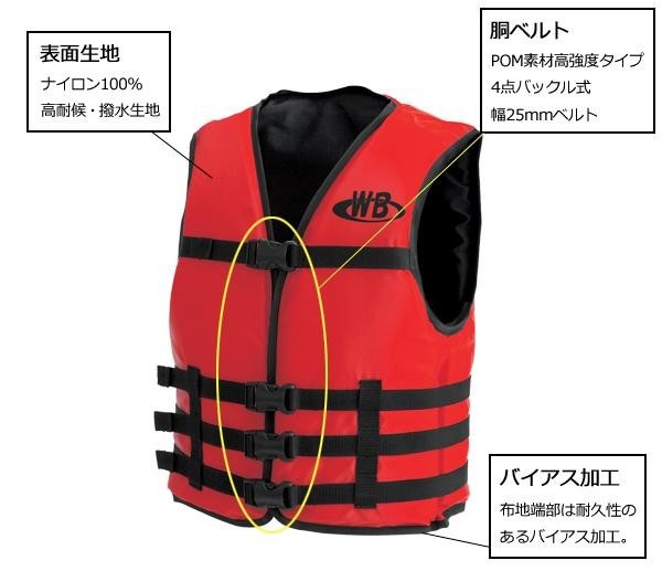 | PWC ・ウエイクボードなどのマリンスポーツに最適。表面生地は高耐候、撥水生地で、胴ベルトは4点バックル式(幅25mm)。布地端部に耐久性があるバイアス加工を施しています。 |