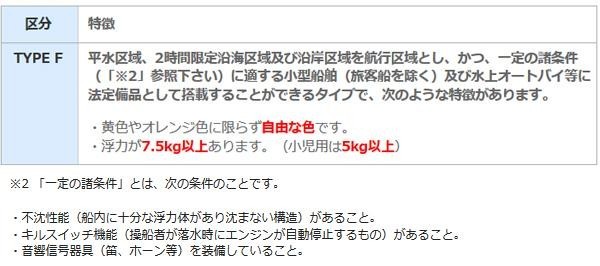 | 仕様 | TYPE-F 用途:小型船舶用救命胴衣 PWC用 型式承認番号:第3395号 適応サイズ:胴囲115cmまで 適応体重:95kgまで 浮力:9.6kgf JCI(日本小型船舶検査機構)認定品 |
