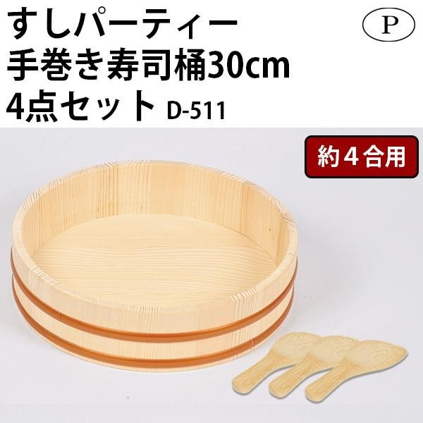 約4合のシャリが入る、直径30cmの寿司桶としゃもじ3本のセットです。おうちで楽しく寿司パーティーしましょう☆ 製造国:中国 素材・材質:飯台:天然木しゃもじ:天然竹 商品サイズ:約外径30×高さ7.5cm 仕様:約4合用食洗機使用不可乾燥機使用不可 セット内容:飯台×1、しゃもじ×3本 ※サプライヤー直送品 ご注文後3~4営業日後の出荷となります【商品名】パール金属 すしパーティー 手巻き寿司桶30cm 4点セット D-511