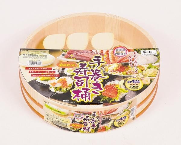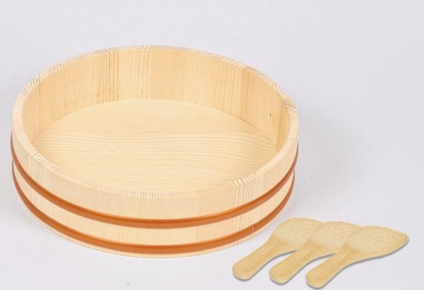 約4合のシャリが入る、直径30cmの寿司桶としゃもじ3本のセットです。おうちで楽しく寿司パーティーしましょう☆