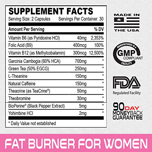 WHY KOR NATURALS? More than just a supplement company Our Name.. Our Brand... it stands for something. That something is for us to be here... As your Resource... As your Motivation... And to be here to help you celebrate your victories - Proudly based in the USA - GMP certified facility - FDA Regulated Facility - Industry-Leading 90 Day Money Back Guarantee WOMEN'S FAT BURNER: THE BEST NATURAL FAT BURNER FOR WOMEN TWO PATENTED INGREDIENTS: Our natural fat burner was formulated to aid in: - Burning Fat - Boosting Your Metabolism - Appetite Suppression - Preserving Muscle - Boosting Energy Levels SPECIFICALLY FOR WOMEN A natural fat burner that uses a powerful formula designed to provide real results for those looking for results. KEY INGREDIENTS for the BEST RESULTS ? Vitamin B6 ? Folic Acid ? Vitamin B12 ? Garcinia Cambogia ? Green Tea ? L-Theanine ? Natural Caffeine ? TeaCrine® ? Theobromine ? BioPerine® ? Yohimbine HCL 100% GUARANTEED RESULTS Add our Fat Burning Pills to your cart today. If in 90 days you do not feel that it is cutting it, we'll send you your money back. 0 |
