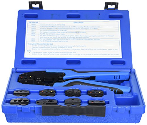 - Quick changing ratcheting tool with 9 die sets for most popular auto terminal crimping applications