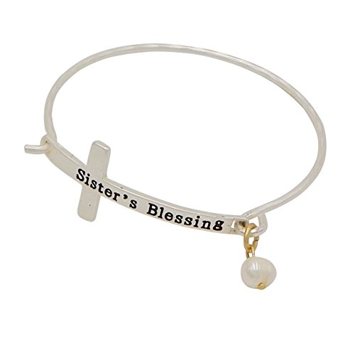 -. Feature : Matte silver tone wire bangle with easy hook closure / Sideways cross decor with inscription and faux pearl dangle accent / Bracelet size: 2.25" diameter opening, for small to medium wrists / An inspirational prayer card is included / Packaged in a lovely gift box