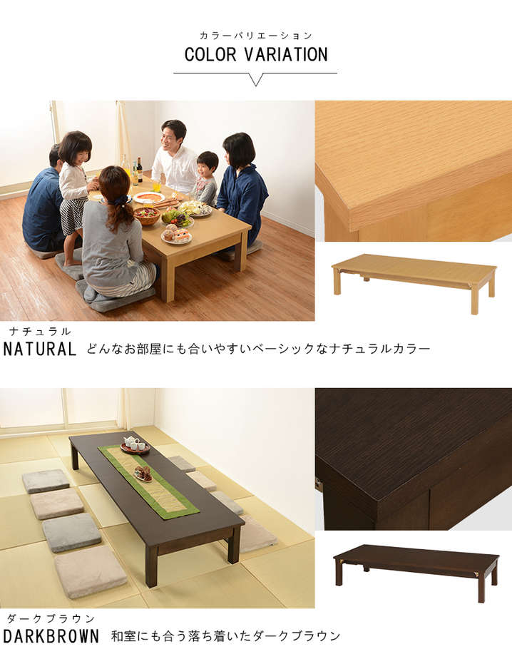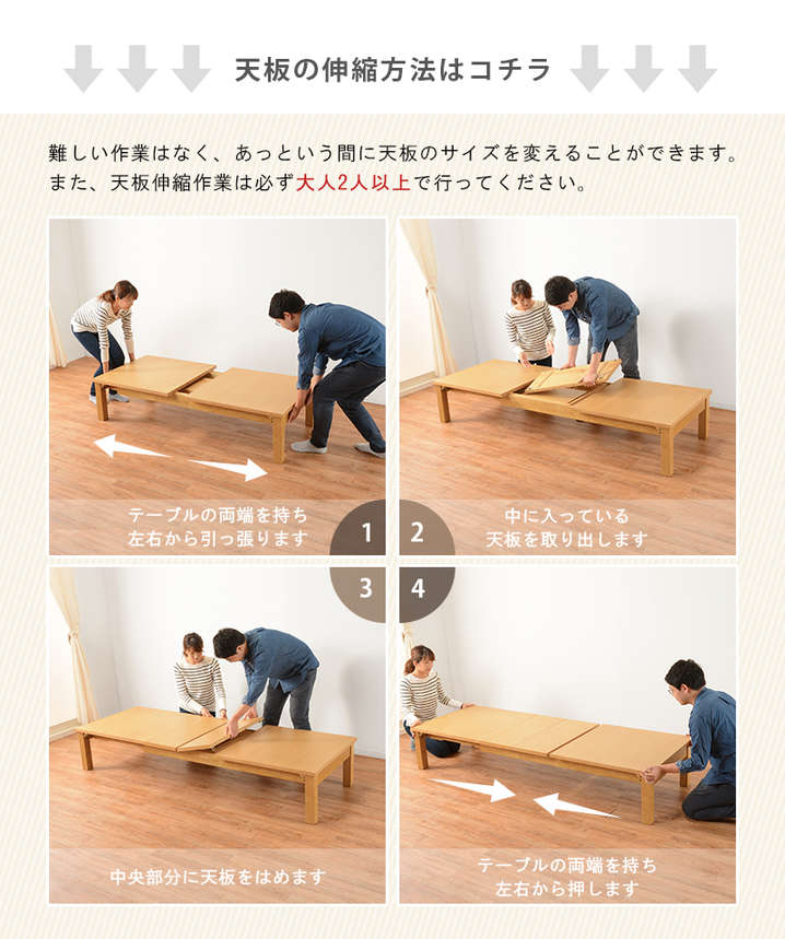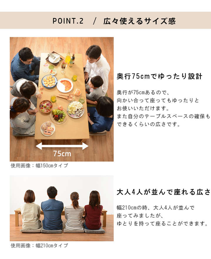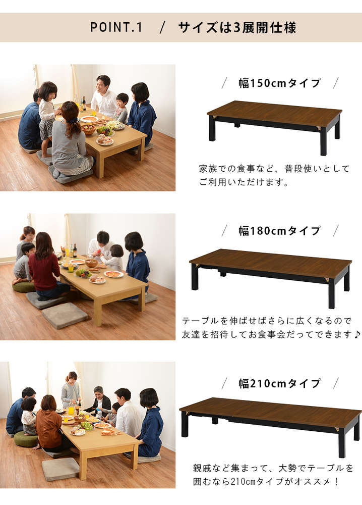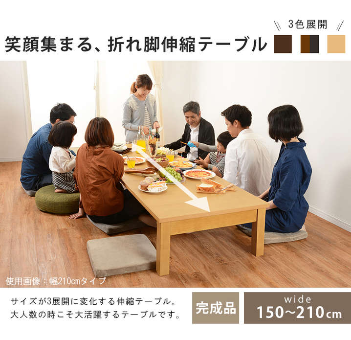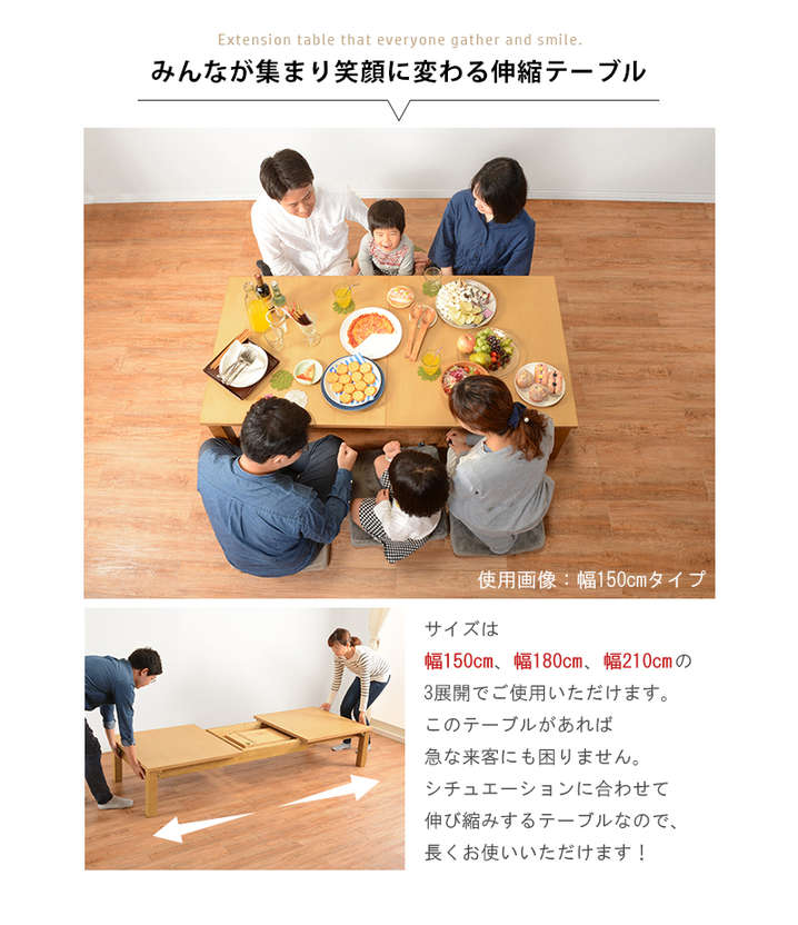 ●サイズが3展開に変化する折れ脚伸縮テーブル。150、180、210cm