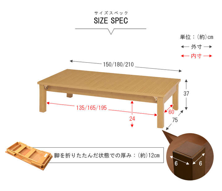●(約)幅150/180/210×奥行75×高さ37(折りたたみ時12)cm