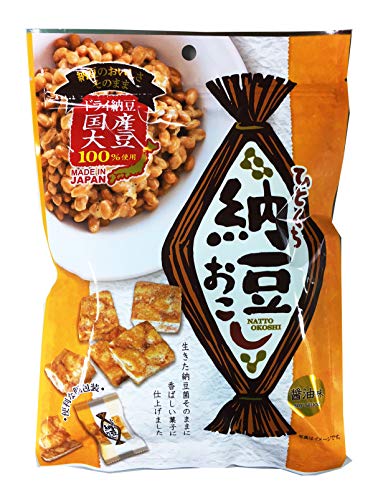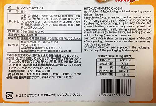 原材料:水飴(国内製造)、小麦パフ(小麦粉、澱粉、食塩)、乾燥納豆(大豆を含む)、ショートニング、砂糖、醤油、ファットスプレッド、バター、粉末醤油、粉からし、食塩/膨張剤、乳化剤、糊料(プルラン)、香料、調味料(核酸),着色料(カロテン、ウコン)