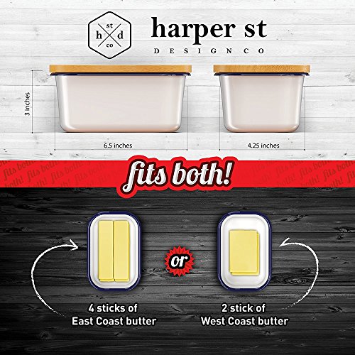 The dimensions of the butter bowl are 6 ½ inches long x 4 ¼ inches wide x 3 inches deep and can fit almost all brands including Land O Lakes, Anchor, Kerrygold, Organic Valley, Breakstone's, Plugra, Tillamook, Cabot, Crystal Farms, Darigold, Keller's, or any other, you'll be able to store up to 1 lb or 4 sticks.
