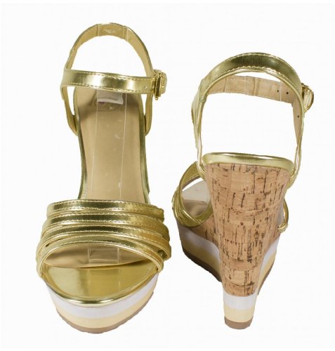 Chipo! By Delicious Cute and Comfy Strappy Fun Colorblock Cork Wedge Sandals in Light Gold Meta...