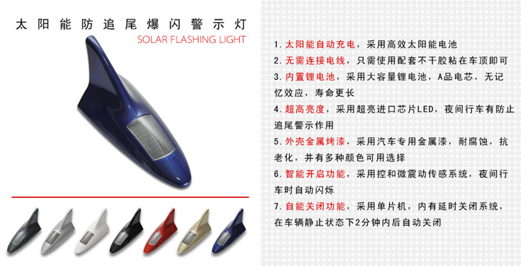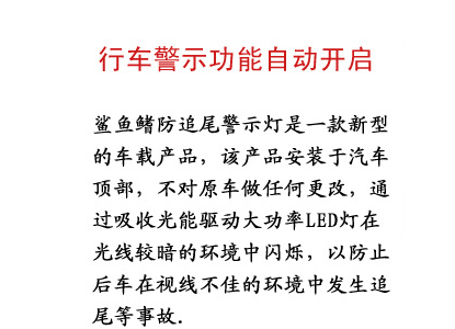 Shark fin anti-rear warning light is a new type of car products, the product installed at the top of the car, do not make any changes to the original car, through the absorption of light to drive high-power LED lights in the darker environment flashing to prevent the car In the line of sight of the environment in the event of rear-end and other accidents, the product will be the same as the high brake lights, will become the factory standard factory.