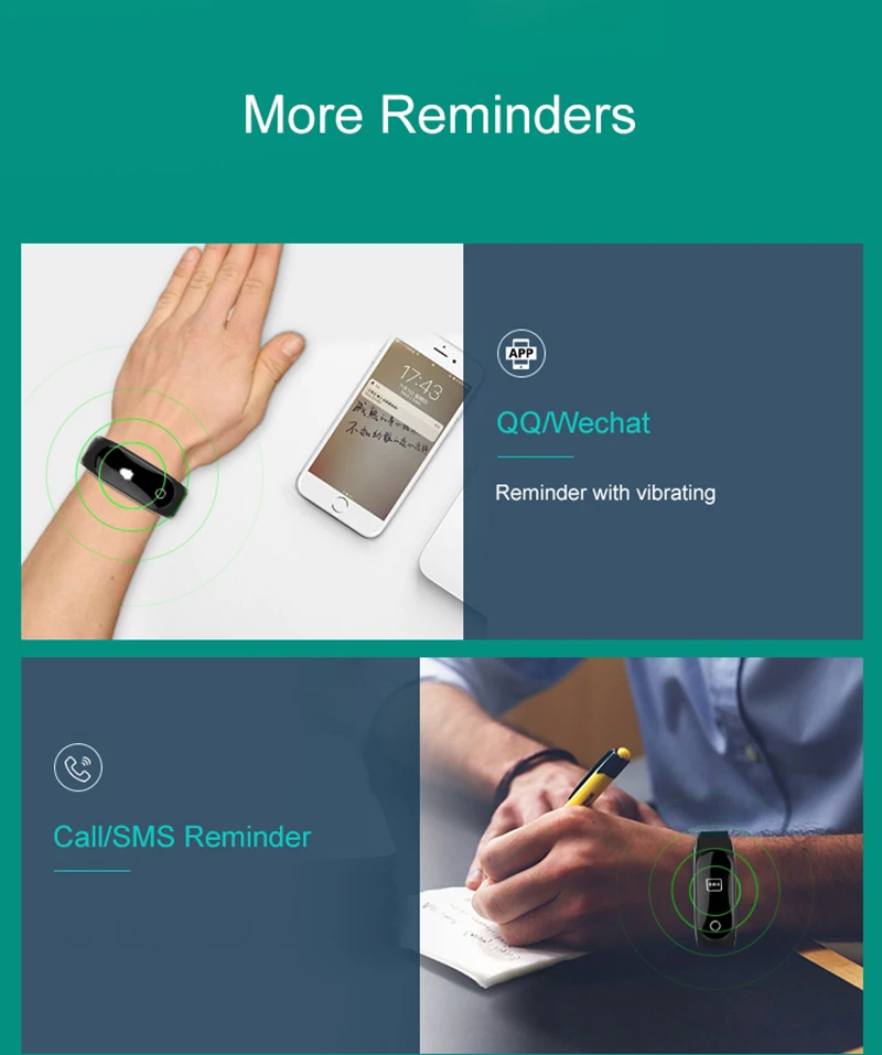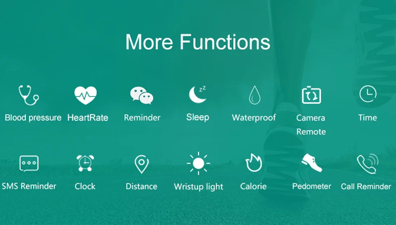 Function:Passometer,Sleep Tracker,Calendar,Heart Rate Tracker,Alarm Clock,Activity Tracker,Fitness Tracker,Social Media Notifications,Message Reminder,Call Reminder