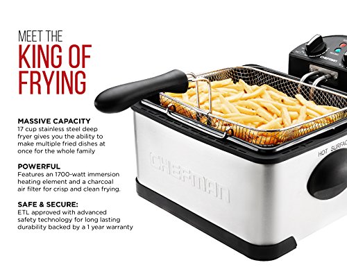 The Chefman Jumbo Size Stainless Steel Dual Deep Fryer is backed by the Chefman Promise 1 Year Limited Warranty.