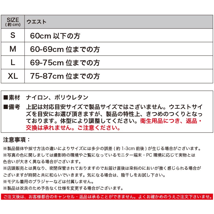 【サイズ】ウエスト目安 S/約60cm以下位までの方、M/約60-69cm位までの方、L/約69-75cm位までの方、XL/約75-87cm位までの方