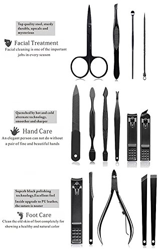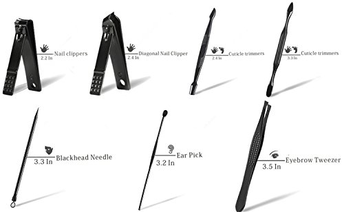 FUNJIA Professional Manicure Pedicure Set Nail Clipper -15 Piece Stainless Steel Heavy Duty Nail Care Aids -Fingernail Clippers,Toenail Clippers -Portable Travel Grooming Kit Tools -Deluxe ((BlackRed)) Small size and lightweight make it convenient to carry,great for travel and daily life! Each tool is manufactured by the careful process of cutting to make sure it can be used more comfortably. And each tool was processed through alternate hot and cold technology to make sure corrosion-resistant,hard and durable. This is also a perfect gift(Christmas, Valentine's Day, Mother's Day, Father's Day, Halloween) for your familes and friends. Products Include: 3*Nail clippers 3*Peeling knife 2*Cuticle trimmers 1*Toe-nail clipper 1*Nail file 1*V-shaped push stick 1*Eyebrow tweezer 1*Multi-purpose scissors 1*Blackhead needle with loop remover 1*Ear pick