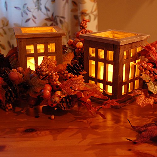 -. Feature : Included: 2 wooden lanterns with 4"battery operated led candles / Timer: 5 hours on / 19 hours off / Flickering amber glow