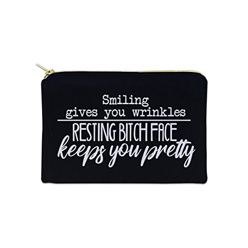 Smiling Gives You Wrinkles 12 oz Cosmetic Makeup Cotton Canvas Bag - (Black Canvas)
