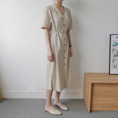 린넨 소재의 브이넥 반팔 원피스 소개해드려요. 큼지막한 버튼으로 앞 부분 포인트가 되어주구요, 어깨부분 살짝 셔링이 잡혀서 은근히 여성스러운 아이템입니다. 허리끈 없이 착용하시면 일자로 툭 떨어지는 여유있는 핏으로 사이즈 구애 없이 착용하시기에 좋아요 :-) 끝단 양옆트임으로 롱한 기장이지만 움직임이 편하게 만들어주었어요. 모델은 베이지 컬러 착용하였습니다. 린넨 소재 특성상 잡사 혹은 크랙이 조금 있을 수 있습니다. 이는 교환, 반품 사유가 되지 않으니 신중한 구매 부탁드려요. MODEL / 166m , 55size , S or 26 , SHOES_240