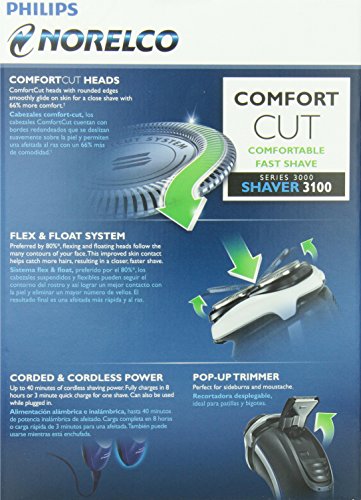 Philips Norelco Shaver 3100 (Model No: PT724) gives you a comfortable shave with less irritation. With more shaving minutes, Shaver 3100 ensures you are always ready to quickly finish your morning routine. ComfortCut heads with rounded edges smoothly glide on skin for a close shave with 66% more comfort. With the Flex and Float System, heads follow the contours of your face, allowing for better contact with your skin and for catching more hairs - resulting in a closer, faster shave. The integrated pop-up trimmer conveniently trims sideburns and moustaches. The Lithium-Ion battery provides 40 minutes of cordless shaving after an 8 hour charge. A 3 minute quick-charge provides enough power for one cordless shave. The shaver is fully washable, simply rinse device under faucet for easy cleaning. Shaver 3100 comes with a 45 day risk-free trial and a full 2-year warranty. For best results, replace shaving heads with HQ8 replacement heads every 12 months. Packaging includes: Electric shaver, protective cap, power cord, cleaning brush.Feature